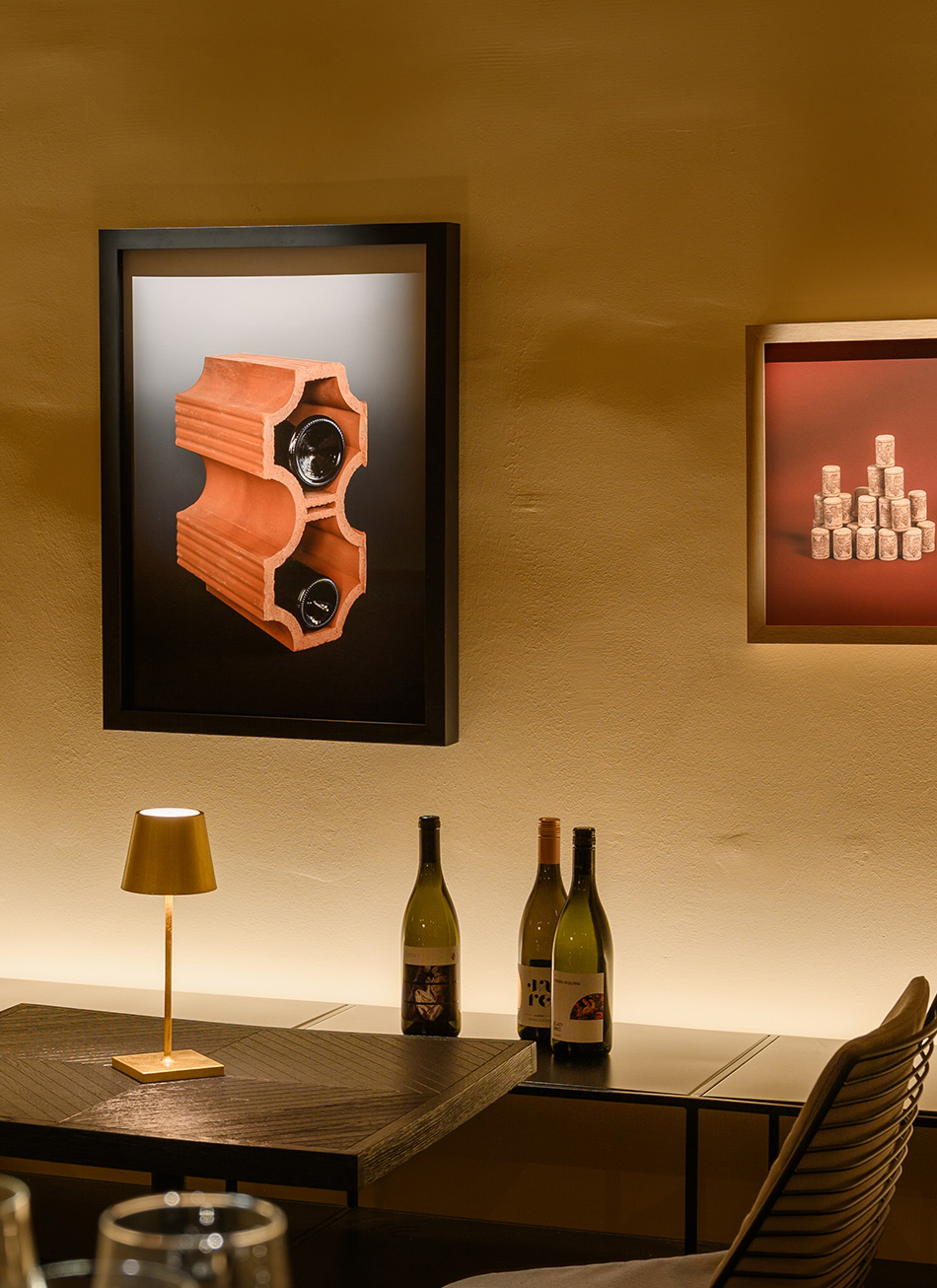 Med stenske oboke umeščena miza daje vtis lebdenja v zraku, medtem ko oboki oblikujejo intimne separeje za manjše družbe. Prostor kljub svoji prijetni zasebnosti omogoča pogostitev do 80 gostov.